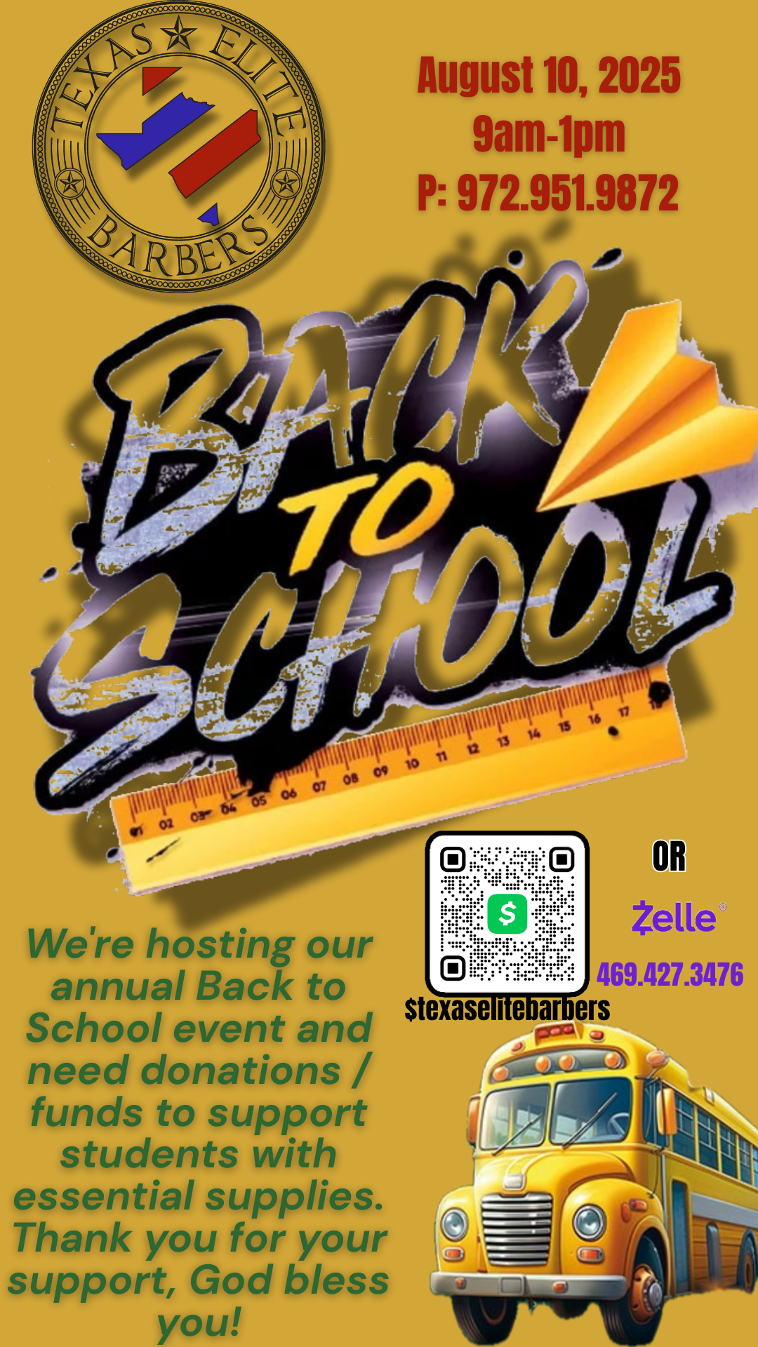 Giving back to the community! Because of your support Texas Elite has been giving back in many ways since 2013, may God bless you! Cash App us by clicking the icon or tap and hold the Zelle QR code and title it “Event.” If you have any questions or will like to help out any other way please reach out via email or by calling Francisco. Have a blessed day!